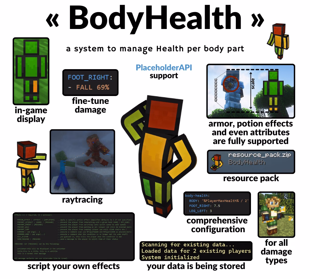 建设阶段维护资源包插件其他本页总览其他 生命指示 BodyHealth(免费)BetterHealthBar(付费)Vitalo(付费)信息SpigotMC https://www.spigotmc.org/resources/119966/Github https://github.com/Mitality/BodyHealth一个指示自身生命值和盔甲值的插件,支持版本为 1.21信息SpigotMC https://www.spigotmc.org/resources/116619/Github https://github.com/toxicity188/BetterHealthBar3文档 (英文) https://github.com/toxicity188/BetterHealthBar3/wiki文档 (中文) https://plugins.8aka.org/ShortDoc/BetterHealthBar3/一个非常棒的生命指示插件,还支持药水效果显示信息SpigotMC https://www.spigotmc.org/resources/114680/一个生命指示插件,支持版本为 1.20 - 1.20.6 小地图 信息SpigotMC https://www.spigotmc.org/resources/114756/Github https://github.com/JNNGL/VanillaMinimapsModrinth https://modrinth.com/plugin/vanillaminimaps 一个超级棒的小地图插件,支持版本为 1.21 生存增强 信息SpigotMC https://www.spigotmc.org/resources/93795/Github https://github.com/ValMobile/RealisticSurvival文档(英文) https://github.com/ValMobile/RealisticSurvival/wiki 该插件增强了原版的生存体验,加入了口渴值,温度系统等,推荐与 BodyHealth 一起使用
