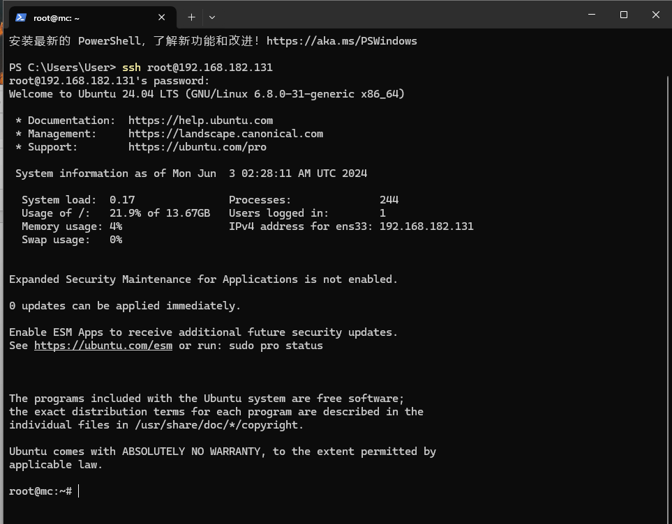 为了让客户能顺利连接服务器,云服务器的 sshd 服务一般默认开启。如果你使用的是家里云,或者云服务器的 sshd 服务确实没有开启 (比如你是只能通过服务商提供的 VNC 或者第三方远控软件连接的服务器,无法使用 ssh),那么你可能需要先开启 sshd 服务才能连接到服务器。 在主流的使用 Systemd 的 Linux 发行版中,执行systemctl enable --now sshd命令即可开启 sshd 服务,如果这些命令都报错,证明 sshd 服务存在问题,你可以把报错复制粘贴到搜索引擎上查询怎么修复这个问题。 开启 sshd 服务后,你就可以连接到这台服务器了。