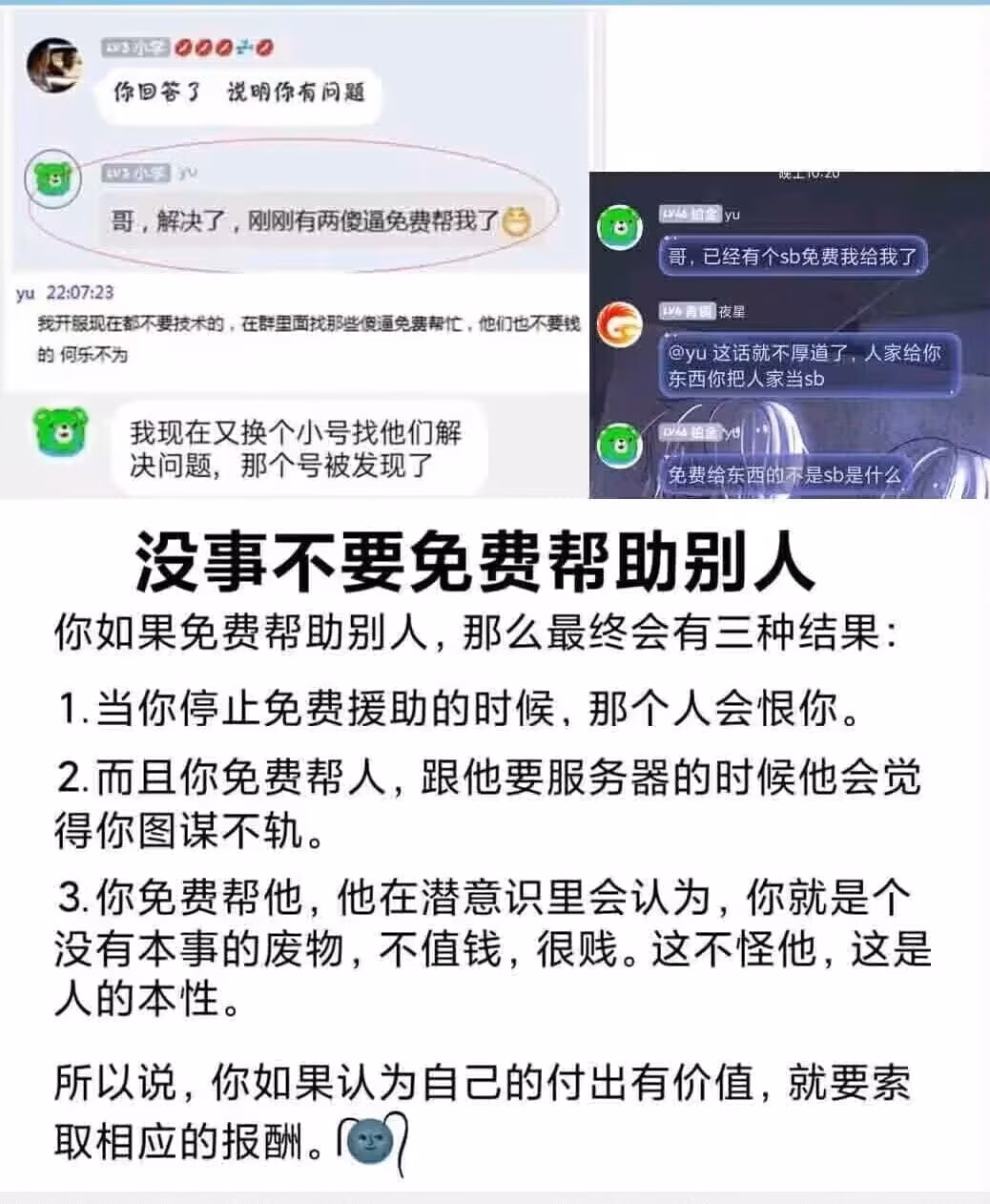 首先明确,你是求助者不是少爷,第二,大多数人还是愿意互帮互助的。